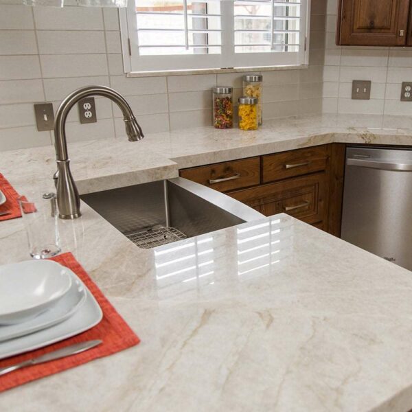 Elegant Stone Fabrication supplies natural stone and quartz countertops, templates, fabricates and installs custom countertops and surfaces. Taj Mahal arizona tile is ideal for kitchen countertops, bathroom vanities, bar tops, accent walls and more. Taj Mahal may not be in stock but many slabs can be ordered. Please confirm with your salesperson for inventory details. Please call